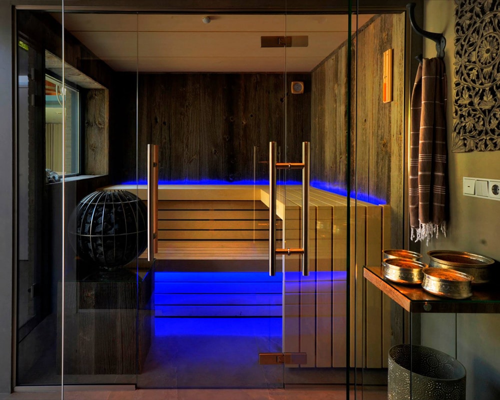 Finse sauna met led kleurentherapie en uitzicht op de patio